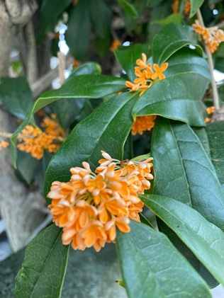 金木犀という名前は、樹皮が動物のサイの足に似ていることから「木犀」と呼ばれ、さらにその花の色を「金」に見立てて名づけられたそうです。